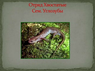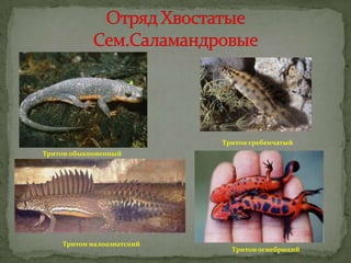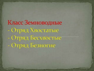 Документ содержит перечень различных видов земноводных, включая тритонов, жаб и лягушек. Упомянуты как обыкновенные, так и редкие виды, такие как тритон огнебрюхий и чесночница. Структура документа предполагает классификацию и описание основных представителей группы земноводных.