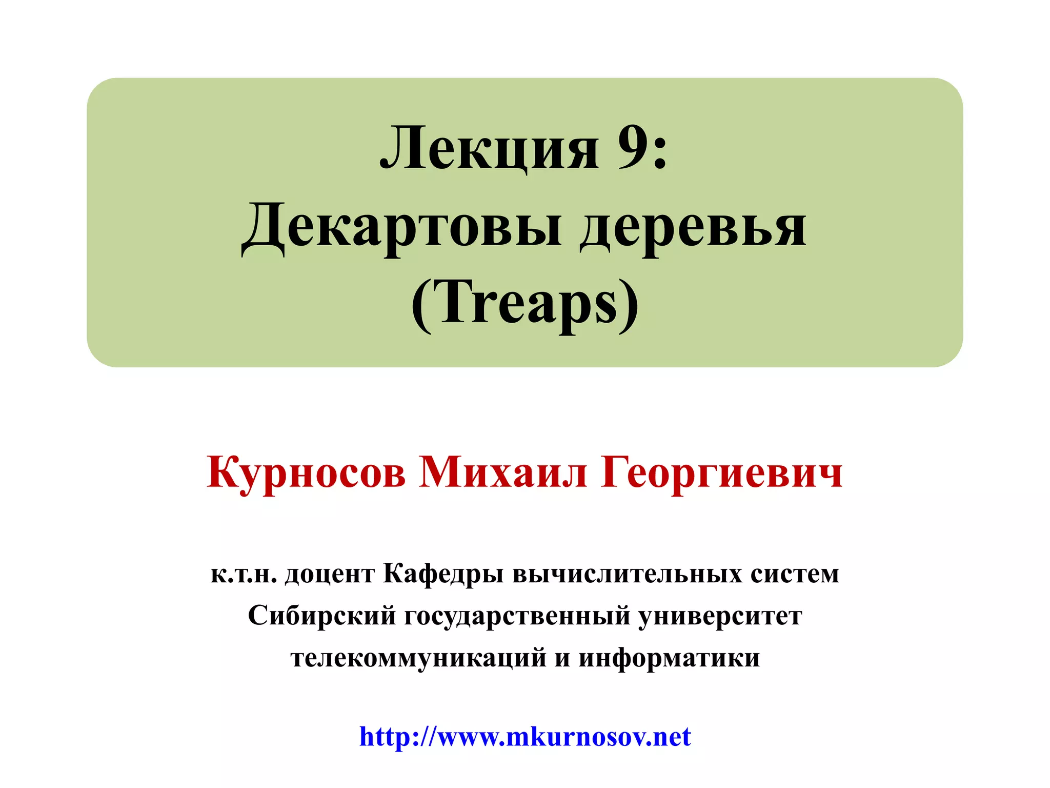 Документ обсуждает декартовы деревья (treaps), которые являются комбинацией бинарных деревьев поиска и бинарных куч, и описывает их основные операции и свойства. Рассматриваются такие операции, как добавление, удаление, разбиение и слияние деревьев, а также их временные сложности. Также упоминаются важные аспекты, такие как случайные приоритеты и их влияние на высоту дерева.
