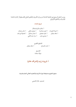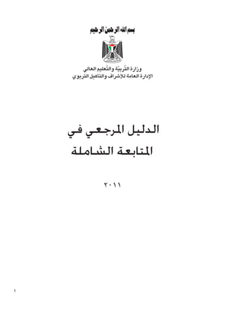 الدليل المرجعي للمُتابعة الشاملة من وزارة التربية والتعليم العالي الفلسطينية يهدف لتحسين التعليم وإعداد كادر معلمين مؤهلين عبر استراتيجيات تتضمن المتابعة الفعالة وتطوير الأداء بأساليب علمية. يركز الدليل على دور المشرفين في تعزيز جودة التعليم وتقديم برامج دعم شاملة لمواجهة التحديات التربوية، ويعتبر مرجعاً مهماً لممارسي الإشراف التربوي. يتضمن الدليل معلومات متعددة حول أهمية المتابعة الشاملة وأهدافها وأدوات قياس الأداء وأفضل الممارسات في العملية التعليمية.