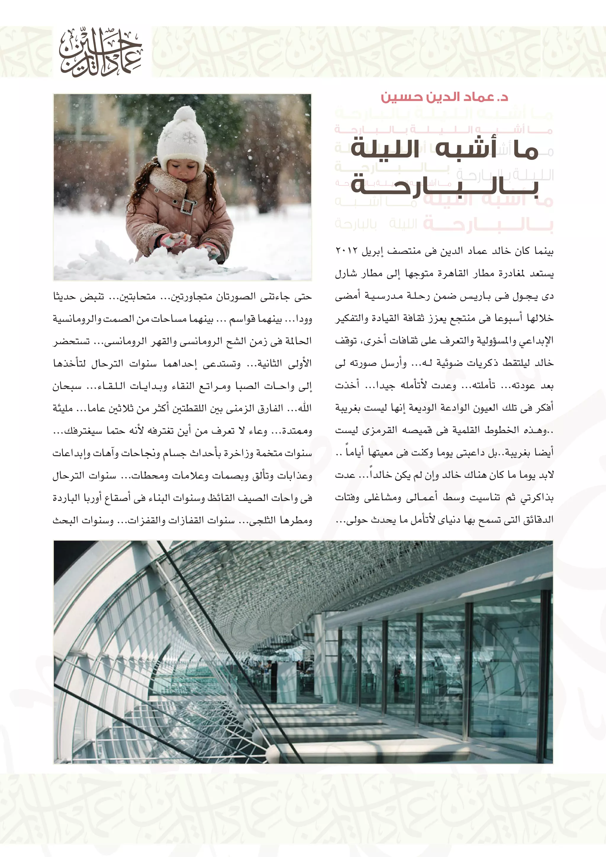 يروي النص تجربة خالد عماد الدين خلال رحلته التعليمية في باريس، حيث يجد نفسه يسترجع ذكريات الماضي وتأملاته حول الحياة. يسلط الضوء على الفارق الزمني وجمال اللحظات التي عاشها مقارنة بذكرياته السابقة، مستحضراً الشعور بالحنين والشغف للحياة. يتجلى في السرد تداخل الزمن والمكان وتأثيرهما على هوية الإنسان وتجربته.