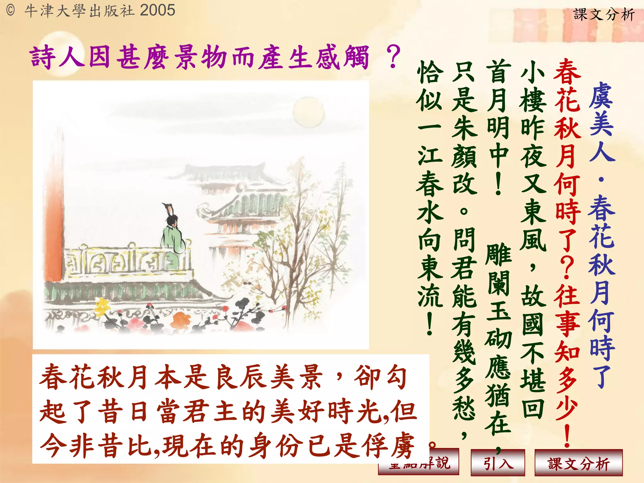第一組詞句︰ 描寫景物︰春花開、秋月夜的良晨美景 所生的感慨︰ 令他想到昔日為君主的美好時光, 但現在為俘虜,雖有春花美景,但日子痛 苦 這令他感慨這些生活不知何時才完結 於是消極希望不要看見美景,免觸景傷情