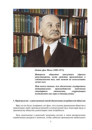 Документ рассматривает бессмертную роль производства и трудовой активности в экономическом развитии общества, утверждая, что свободный рынок и индивидуальная ответственность являются обязательными для достижения благосостояния. Он критикует кейнсианские и монетарные подходы, считая их причина́ми экономических кризисов и долгового бремени, и подчеркивает значение австрийской школы экономики, которая акцентирует внимание на саморегуляции рынка и инновациях. Автор также утверждает, что истинное богатство создается только реальным трудом и производством, а не искусственным увеличением денежной массы.