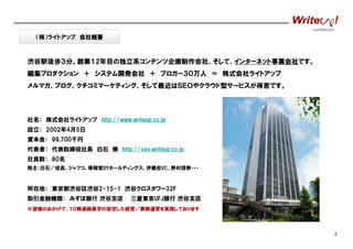 システム開発会社 + ブロガー30万人 = 株式会社ライトアップ メルマガ、ブログ、クチコミマーケティング、そして最近はSEOやクラウド型サービスが得意です。 社名: 株式会社ライトアップ http://www.writeup.co.jp 設立: 2002年4月5日 資本金: 99,700千円 代表者: 代表取締役社長 白石 崇 http://ceo.writeup.co.jp 社員数: 80名 株主:白石/役員、ジャフコ、博報堂DYホールディングス、伊藤忠VC、野村證券・・・ 所在地: 東京都渋谷区渋谷2-15-1 渋谷クロスタワー32F 取引金融機関: みずほ銀行 渋谷支店 三菱東京UFJ銀行 渋谷支店 ※皆様のおかげで、10期連続黒字の安定した経営/業務運営を実現しております 2