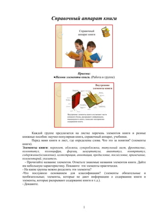 Документ описывает элементы книги и их функции, включая переплет, титульный лист, аннотацию и содержание, а также дает практические советы по их классификации и поиску информации. Предлагаются рекомендации по составлению библиографических описаний, важность которых подчеркнута для работы с научно-популярной литературой. Включены также советы по использованию справочной литературы и проведения эффективного поиска информации.