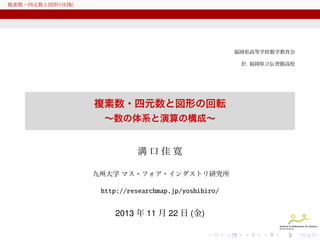 自然数, 整数, 有理数, 実数と数にもいろいろあります. 数の加算や乗算などの演算は日常生活でも自然に利用しています. もちろん, さまざまな科学技術への数学の応用の基本です. 虚数という概念を加えた複素数の乗算は, 2次元空間での回転移動とも関係し, 図形の変換にも用いられます. さらに, 四元数という数を考えると, 今度は, 3次元空間での立体図形の回転に対応する演算があります.