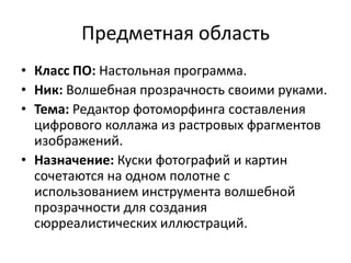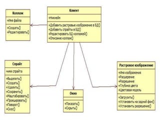 Документ описывает расчетную работу по моделированию программного обеспечения, посвященную созданию программы для редактирования цифровых коллажей. Программа позволяет пользователю выделять, обрабатывать и комбинировать растровые изображения и спрайты с использованием различных инструментов и функций, таких как волшебная прозрачность и аффинные преобразования. Также предоставлены инструкции по использованию программы и описаны основные характеристики растровых изображений и базы данных спрайтов.