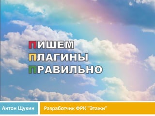 Документ представляет собой руководство по разработке плагинов для WordPress, написанное Антоном Щукиным. Он охватывает ключевые аспекты, такие как объектно-ориентированное программирование, подключение стилей и скриптов, настройки плагина и использование хуков. Важное внимание уделяется правильному написанию плагинов и предотвращению ошибок с глобальными переменными.