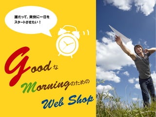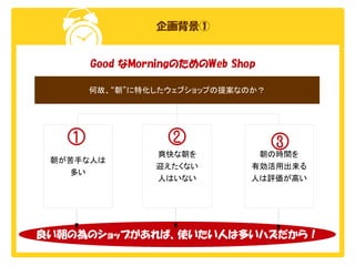企画背景① Good なMorningのためのWeb Shop 何故、“朝”に特化したウェブショップの提案なのか? ① ② 朝が苦手な人は 多い 爽快な朝を 迎えたくない 人はいない ③ 朝の時間を 有効活用出来る 人は評価が高い 良い朝の為のショップがあれば、使いたい人は多いハズだから!