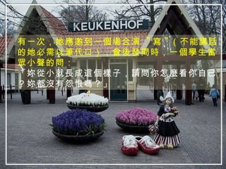 文档讲述了一位脑性麻痹患者黄美廉女士的励志故事,她通过自己的努力和积极心态获得了艺术博士学位,并激励了他人。她强调了乐观的生活态度,认为幸福在于珍惜所拥有的,而不在于追求缺失的。文中还探讨了逆境中的学习和成长,鼓励人们从困境中发现积极的意义。