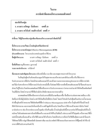 อภิชญา นิ่มจินดา เลขที่ 28 2. นางสาว ทวินันท์ เอมศิรานันท์ เลขที่ 37 คาชี้แจง ให้ ผ้ ูเรี ยนแต่ ละกลุ่มเขียนข้ อเสนอโครงงานตามหัวข้ อต่ อไปนี้ ชื่อโครงงาน (ภาษาไทย) นาหมักจุลนทรีย์มหัศจรรย์ ้ ิ ชื่อโครงงาน (ภาษาอังกฤษ) Effective Microorganisms (EM) ประเภทโครงงาน โครงงานประเภทประยุกต์การใช้งาน ชื่ อผู้ทาโครงงาน นางสาว อภิชญา นิ่มจินดา เลขที่ 28 นางสาว ทวินนท์ เอมศิรานันท์ เลขที่ 37 ั ชื่อทีปรึกษา ครู เขื่อนทอง มูลวรรณ์ ่ ระยะเวลาดาเนินงาน 4 สัปดาห์ ทีมาและความสาคัญของโครงงาน (อธิบายถึงที่มา แนวคิด และเหตุผล ของการทาโครงงาน) ่ ั ในปั จจุบนผูคนในสังคมหันมาดูแลใส่ ใจสุ ขภาพ และเข้าหาธรรมชาติกนมากขึ้น เห็นได้จากการ ั ้ รับประทานอาหารที่มีประโยชน์จาพวกผักและผลไม้ และด้วยความหลากหลายของรู ปแบบอาหารที่มีการนาผัก ผลไม้มารังสรรค์อาหารให้มีความน่ารับประทานยิงขึ้น จึงส่ งผลให้มีการเหลือทิ้งของผักและผลไม้ ซึ่ งคนส่ วนมาก ่ มักจะไม่รู้ถึงประโยชน์ของเศษผักผลไม้ที่เหลือจากการรับประทานของเราว่าสามารถนามาทาให้เกิดเป็ นผลิตภัณฑ์ ใหม่ที่มีประโยชน์ สามารถใช้ได้อย่างมีประสิ ทธิภาพและหลากหลายด้าน จากเศษผักผลไม้ที่เหลือจากการรับประทานที่มีปริ มาณเพิ่มมากขึ้น ซึ่ งเป็ นภาระต่อสภาพแวดล้อม เราจึง คิดที่จะนาสิ่ งที่ดูไม่มีประโยชน์ มาทาให้เกิดเป็ นสิ่ งที่มีประโยชน์ โดยนาไปหมักในถังปุ๋ ยพร้อมกับกากน้ าตาลและ ่ หัวเชื้อจุลินทรี ย ์ ออกมาจะได้ผลิตภัณฑ์ที่ชื่อว่า Effective Microorganisms (EM) หรื อ น้ าจุลินทรี ย ์ ซึ่ งแม้วาจะมี สี สันไม่สวยงาม และอาจจะมีกลิ่นเหม็นบ้าง แต่ถาพูดถึงเรื่ องประโยชน์ในการใช้งานแล้วจะพบว่ามีประโยชน์ ้ นานับประการ เช่น ถ้าหากท่อระบายน้ าอุดตัน หรื อส้วมเต็ม น้ าหมักจุลินทรี ยน้ ีสามารถช่วยได้โดยจุลินทรี ยในน้ า ์ ์ หมักจะไปช่วยย่อยสลายสารอินทรี ยที่ตกค้าง และจะทาให้ส้วมไม่เต็มเร็ ว ท่อระบายน้ าก็ไม่อุดตัน หรื ออาจจะใช้น้ า ์ หมักนี้ช่วยดับกลิ่นของส้วม หรื อใช้ลางตลาดได้ หรื อประโยชน์อีกประการคือนาไปใช้เป็ นปุ๋ ยธรรมชาติ ซึ่ งจะทา ้ ให้ผกผลไม้ที่เราปลูกได้ผลผลิตดี ปลอดสารพิษ และประหยัดค่าใช้จ่ายและอันตรายจากการใช้ปุ๋ยเคมี ทาให้เรามี ั อาหารที่ดีรับประทานกันต่อไป