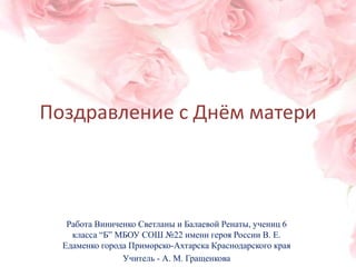 Ученицы 6 класса 'Б' Светлана Виниченко и Рената Балаева подготовили поздравление с Днём матери, обращаясь к своим мамам с выражением любви и благодарности. В их послании подчеркивается, что материнское сердце всегда наполнено заботой, теплом и безусловной любовью. Мама является главным богатством и источником счастья в жизни детей.