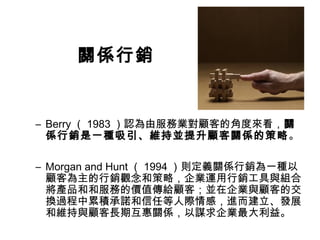本文件探讨了客户关系管理(CRM)在服务行业的重要性,强调了通过关系营销策略来吸引、维持和增强客户关系的必要性。同时,文件分析了客户关系的不同发展阶段,并指出企业应关注现有客户的满意度与忠诚度,以实现长期盈利。最后,强调建立和维持良好的客户关系可以为企业与客户双方带来多种利益。