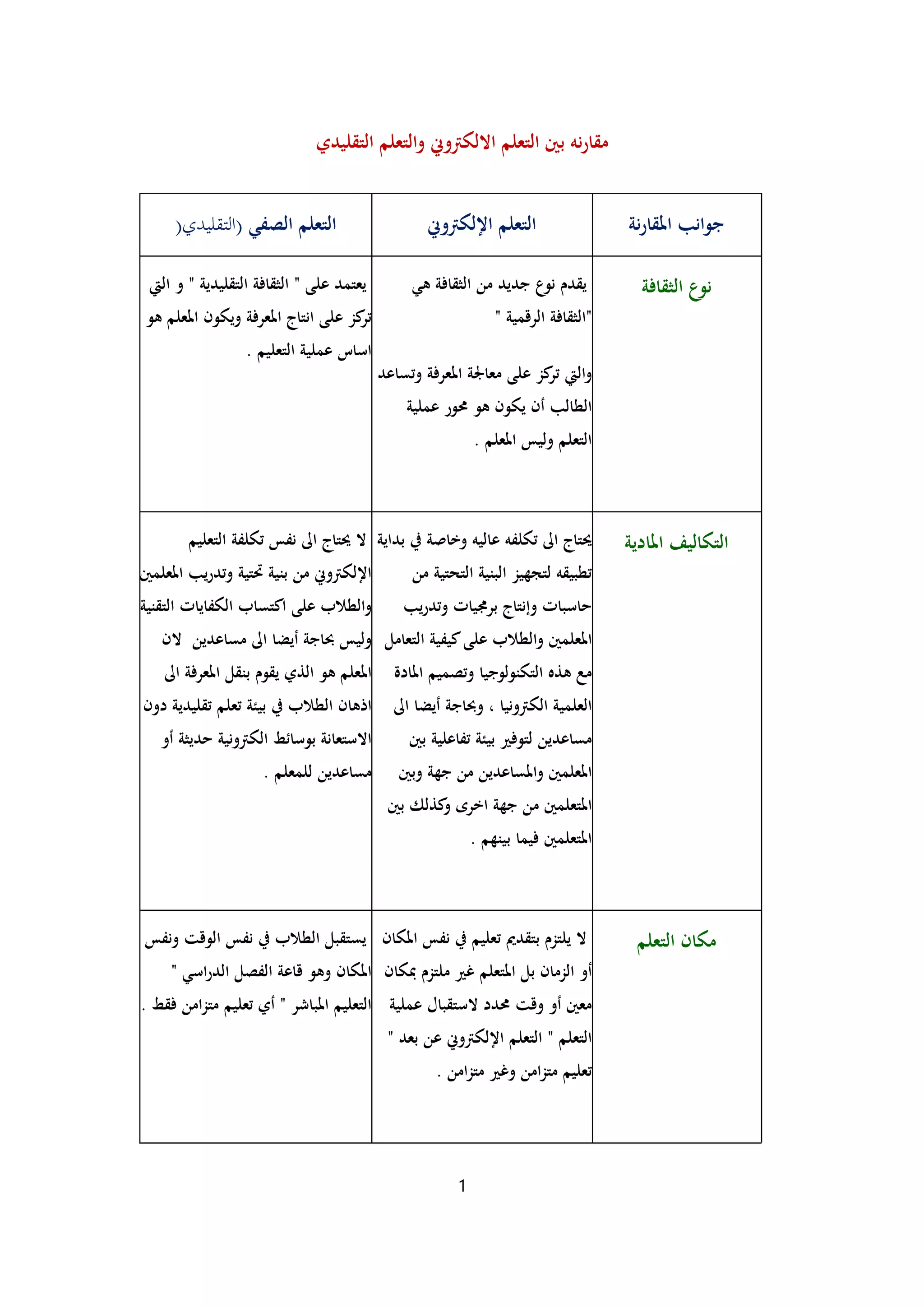 تناقش الوثيقة مقارنة بين التعلم الإلكتروني والتعلم التقليدي، حيث يركز التعلم الإلكتروني على ثقافة جديدة تعتمد على المعرفة الذاتية ومرونة الوقت والمكان، بينما يعتمد التعلم التقليدي على الحضور الشخصي والنمطية. يتميز التعلم الإلكتروني بتوفير تكاليف أقل، فرص أكبر لعدد المتعلمين، وتحديث محتوى التعليم بسهولة، بينما الاحتياجات الفردية والتعليم البشري محدود في التعلم التقليدي. تأكد من أن التفاعل والمشاركة في التعلم الإلكتروني يُشجع على الإبداع والفكر النقدي أكثر من التعلم التقليدي.