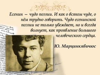 Презентация посвящена творчеству Сергея Есенина и его вкладу в русскую поэзию. В документе рассматриваются жизненные этапы поэта, ключевые темы его лирики, а также его уникальный стиль, отражающий любовь к природе и родине. Особое внимание уделяется личной трагедии Есенина и его восприятию изменений в России в годы революции.