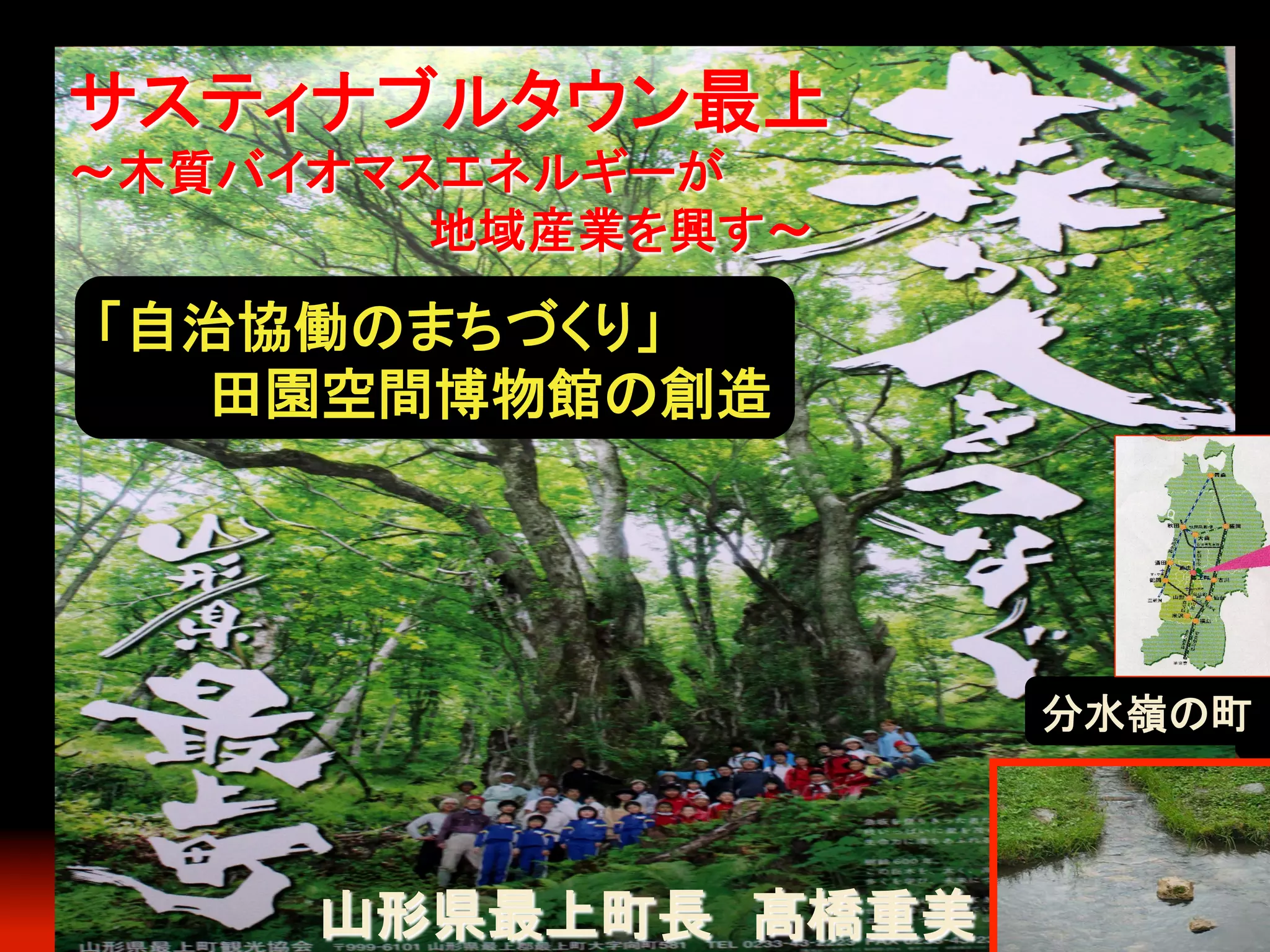 サスティナブルタウン最上 ~木質バイオマスエネルギーが 地域産業を興す~ 「自治協働のまちづくり」 田園空間博物館の創造 分水嶺の町 山形県最上町長 髙橋重美