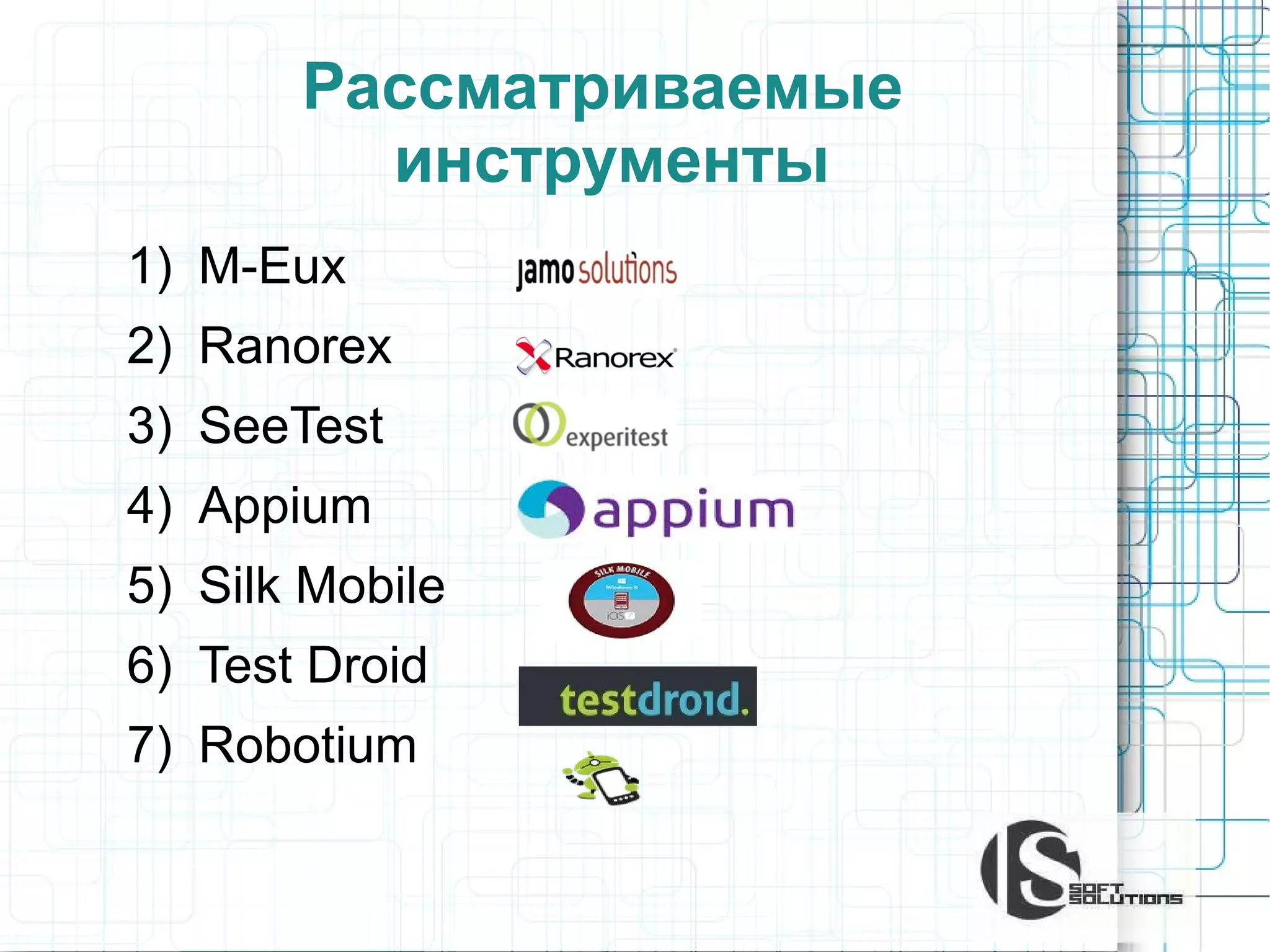 Документ содержит сравнительный анализ инструментов автоматизации тестирования мобильных приложений, включая m-eux, ranorex, seetest, appium, silk mobile, testdroid и robotium. Оценены возможности инструментов по лицензированию, поддерживаемым платформам, разработке тестов и интеграции с IDE. Выделены основные недостатки каждого инструмента, включая стоимость лицензий и ограничения в поддерживаемых платформах.