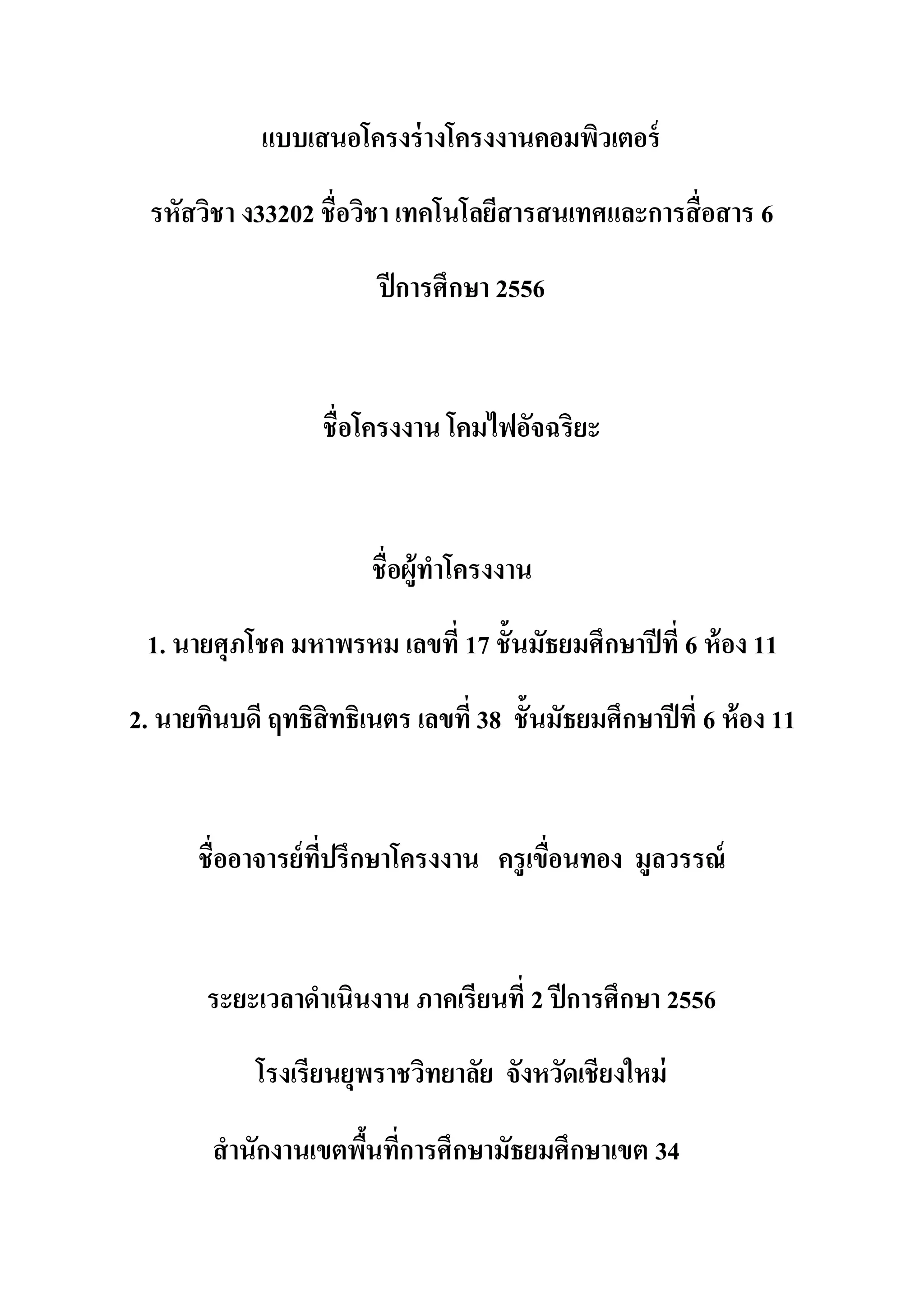 แบบเสนอโครงร่ างโครงงานคอมพิวเตอร์ รหัสวิชา ง33202
