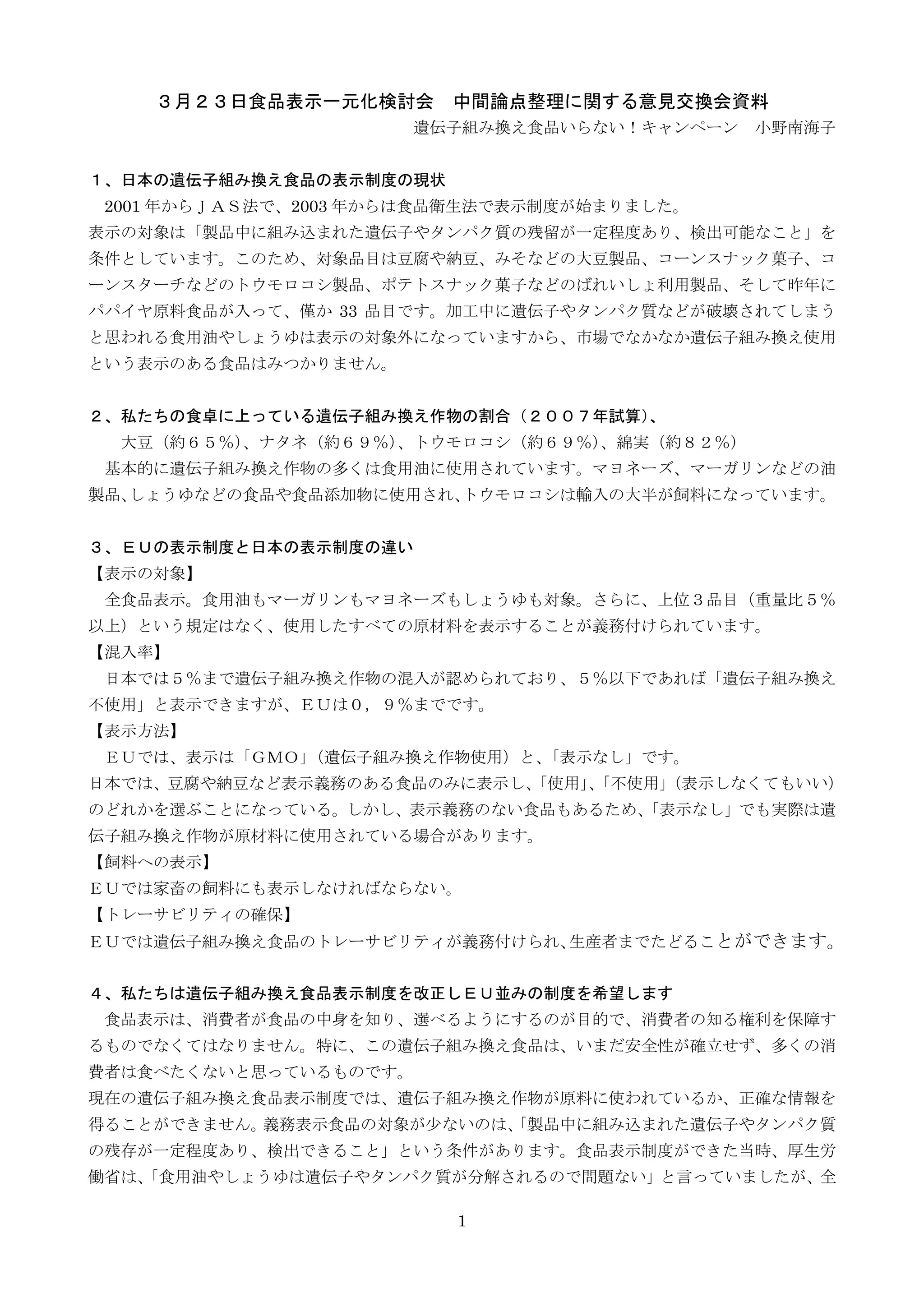 3月23日食品表示一元化検討会 中間論点整理に関する意見交換会資料 遺伝子組み換え食品いらない!キャンペーン 小野南海子 1、日本の遺伝子組み換え食品の表示制度の現状 2001