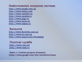 знаходження необхідної інформації є пошукові служби Інтернету;