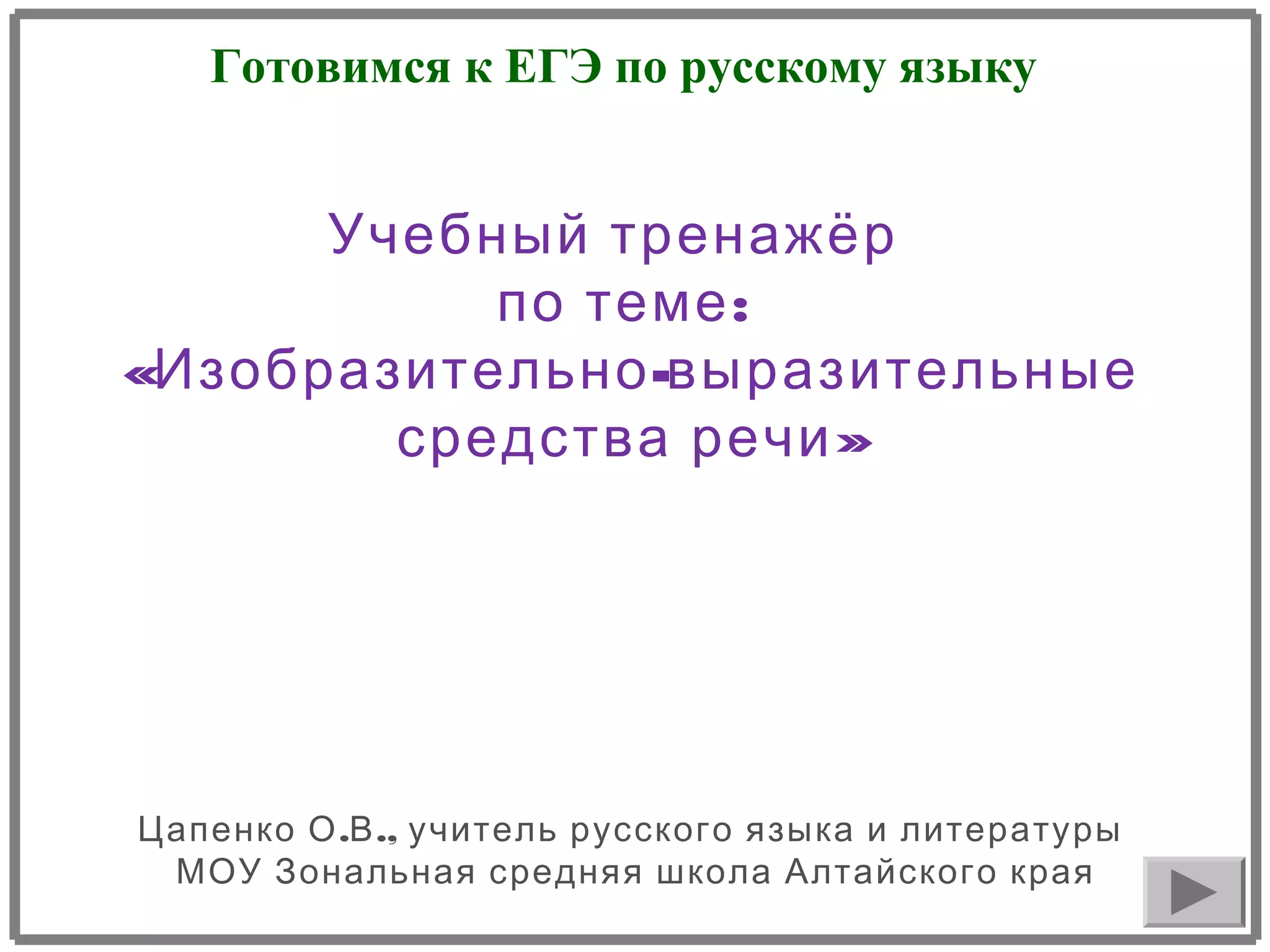 Документ представляет собой учебный тренажёр для подготовки к ЕГЭ по русскому языку, сосредоточенный на изобразительно-выразительных средств речи. В нём содержится ряд заданий с вопросами о тропах и выражениях, а также инструкции по использованию тренировочного материала. Основная цель документа - помочь студентам улучшить свои знания и навыки перед экзаменом.