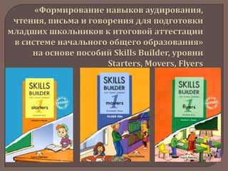 Документ описывает новую модель итоговой аттестации по английскому языку для начальной школы, разработанную в соответствии с ФГОС и программами, утвержденными Минобрнауки РФ. Итоговая аттестация включает протестирование навыков чтения, письма, аудирования и говорения, разделенные на два этапа. Также представлены тренировочные задания и учебные пособия для подготовки к международным экзаменам.