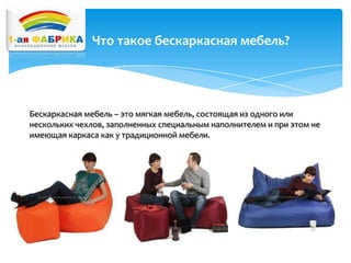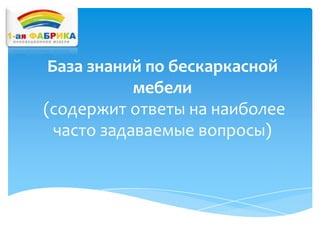 Документ представляет собой базу знаний о бескаркасной мебели, включая ответы на часто задаваемые вопросы о её видах, формах и материалах. Бескаркасная мебель не имеет каркасной основы, а её наполнение состоит из гранул полистирола, что делает её удобной и экологически безопасной. Документ также указывает на различные применения бескаркасной мебели в различных интерьерах и её популярность среди детей и взрослых.
