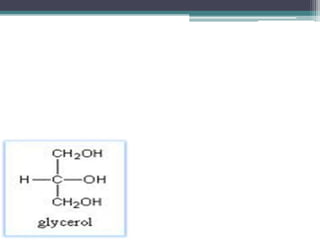 This document discusses fats and oils. It defines them as esters of fatty acids and glycerol that are insoluble in water but soluble in organic solvents. The document outlines the structure of a triglyceride, the main component of fats and oils, and describes how triglycerides interact with water to form micelles which allow fats and oils to be absorbed and transported in the body.