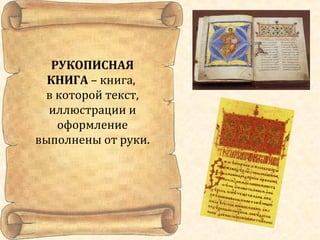 Рукописные книги древней Руси создавались вручную монахами и представляли собой трудоемкий и дорогой процесс. Самые ранние из них датируются XI веком и изготавливались из высококачественного пергамента, с текстом, написанным гусиным пером и украшенным цветными инициалами. Большую часть таких книг составляли летописи, фиксировавшие события по годам.