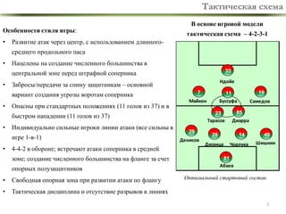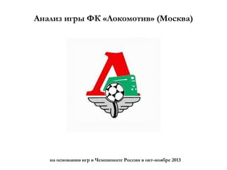 Анализ игры ФК «Локомотив» в чемпионате России 2013 года демонстрирует их тактическую схему 4-2-3-1 с акцентом на развитие атак через центр и длинные передачи, что создает численное преимущество в центральной зоне. В игре команды отмечается опасность при стандартах и акцент на индивидуальных качествах игроков в атаке, таких как Ндойе и Майкон. Оборонительная тактика включает встречу атак соперника в средней зоне с акцентом на создание численного большинства на флангах, а также низкую линию обороны для минимизации пространства перед штрафной.