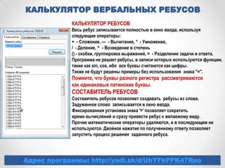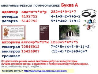 Документ представляет собой инструкции и примеры по созданию и решению анаграмм-ребусов в области информатики. Описываются операторы для ввода математических выражений и формат записи ребусов, а также даются ссылки на ресурсы и контактные данные составителя. Предложены методы для оптимизации процесса и акцент на то, что ребусы не могут включать определённые математические функции.