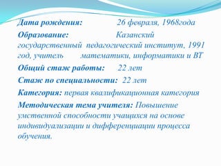 Мурзина Силуза Назиповна - учитель математики и информатики с 22-летним стажем, работающая в МOU 'Амикеевская СОШ' в Татарстане. Она имеет первую квалификационную категорию и активно занимается повышением умственной способности учащихся через индивидуализацию и дифференциацию обучения, что подтверждается её успехами в олимпиадах и конкурсах. Ученики Мурзиной достигли высоких результатов на различных математических и информационных олимпиадах, а также она сама участвует в семинарах и курсах повышения квалификации.