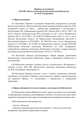 Правила пользования Вологодской областной юношеской библиотекой регламентируют порядок обслуживания пользователей, их права и обязанности, а также права и ответственность библиотеки. Пользователи могут получать услуги как бесплатно, так и платно, включая доступ к документам и консультации, при соблюдении установленных правил. Библиотека обязана обеспечивать доступ к информации, хранить персональные данные пользователей и организовывать мероприятия, а также имеет право отказать в обслуживании нарушителям правил.