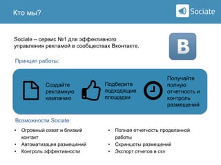 Sociate – это сервис для эффективного управления рекламой в сообществах ВКонтакте, предлагающий автоматизированное размещение рекламы, анализ эффективности и полную отчетность. Платформа позволяет брендам, промоакциям и интернет-магазинам управлять рекламными кампаниями с помощью таргетинга и прогнозирования результатов. Примеры успешных кейсов включают привлечение посетителей к открытию кафе Krispy Kreme и продвижение приложения PayPal.