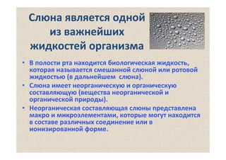 Документ описывает биохимию слюны, подчеркивая её основные компоненты и функции, включая неорганические и органические вещества, такие как белки, ферменты и иммуноглобулины. Слюна играет ключевую роль в защитных механизмах ротовой полости, обеспечивая антимикробное действие и способствуя минеральному обмену. Обсуждаются различные группы белков, их функции и влияние на здоровье полости рта.