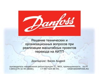Доклад освещает технические и организационные аспекты реализации масштабных проектов перехода на автоматизированные индивидуальные тепловые пункты (АИТП), включая ошибки проектирования и монтажа. Особое внимание уделяется расчетам, наладочным работам и преимуществам применения заводских тепловых пунктов. В документе также представлены примеры успешных проектов и список услуг, предоставляемых компанией Danfoss.