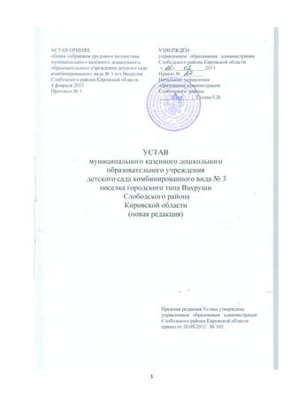 Документ описывает устав муниципального казенного дошкольного образовательного учреждения детского сада комбинированного вида No 3 в посёлке Вахруши, Кировская область. Учреждение предоставляет услуги дошкольного образования для детей от 2 месяцев до 7 лет и регулируется местным бюджетом, обеспечивая бесплатное и доступное образование. В документе также указаны права и обязанности учреждения, порядок приема детей и организация образовательного процесса.