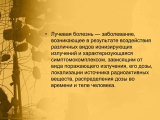 Лучевая болезнь - заболевание, возникающее из-за воздействия ионизирующих излучений, характеризующееся разнообразными симптомами в зависимости от дозы и типа облучения. Общие формы включают острую и хроническую лучевую болезнь, с различной степенью тяжести, исходя из полученной дозы радиации. Дозы свыше 10 гр считаются смертельными, и отдаленные последствия могут проявляться через месяцы или годы.