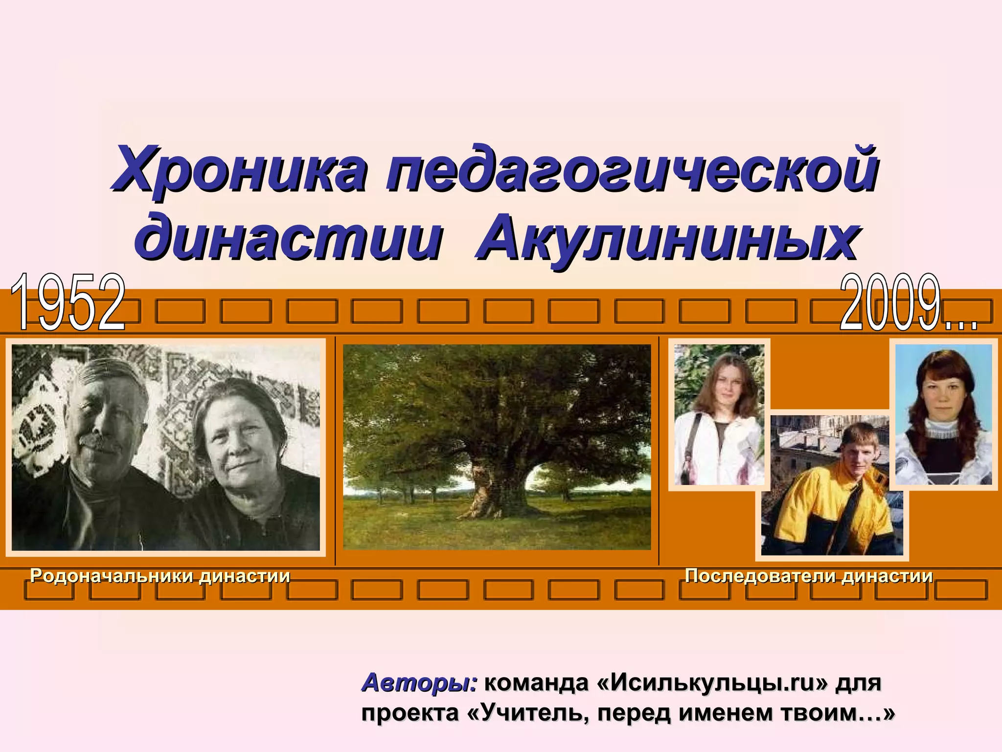 Документ описывает историю педагогической династии акулининых, чей общий педагогический стаж составляет 385 лет. Основное внимание уделяется жизни и карьере родоначальников, их детям, а также их последователям, оказавшим значительное влияние на образовательный процесс в регионе. Педагогическая деятельность членов семьи охватывает различные учреждения, и многие из них стали заслуженными учителями и ветеранами труда.