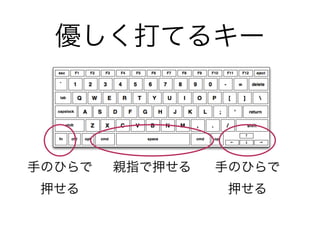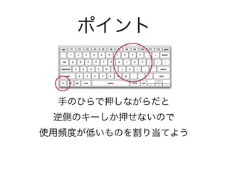 This document discusses keyboard customization options for Mac OS X, including using Emacs commands with Control-i, Control-a etc., VI mode navigation with Command-R plus hjkl, and the KeyRemap4MacBook utility to remap keyboard functions with FN keys, spaces, and custom shortcuts. It provides links to resources on customizing keyboard functions in Mac OS X.