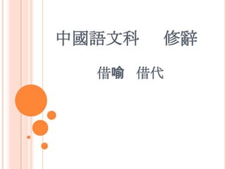 借代(又稱換名及替代) 不是比喻,是與本體有密切關係的事物 (借體)代替本體的修辭方法。 用同一事物中的特徵或其中一部份去代表 事物的全部。