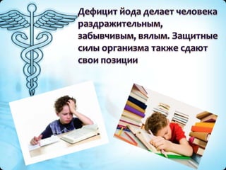 Йод является жизненно важным элементом для человеческого организма, необходимым для выработки тироксина, который регулирует обмен веществ и работу различных систем. Недостаток йода может привести к проблемам с настроением и здоровьем. Профилактика дефицита йода включает в себя использование йодированной соли и увеличение потребления морепродуктов.
