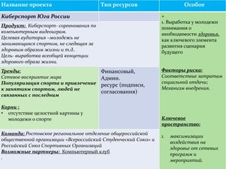 Проект "Киберспорт Юга России" направлен на создание концепции здорового образа жизни у молодежи через внедрение киберспорта и сетевых соревнований. Целевая аудитория включает молодежь, не интересующуюся спортом, с целью привлечения ее к активному образу жизни. Основными партнерами проекта являются ростовское региональное отделение Всероссийского студенческого союза и российский союз спортивных организаций.
