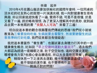 本文件记录了吴声达对陈奕苍所著书籍《良医人人可为》的阅读心得与反思,强调了健康与自我管理的重要性。文中提到要改变传统生活习惯,例如早上空腹运动和注重排毒,以提高健康水平。吴声达希望通过分享书中的健康理念,鼓励更多人关注自身健康,重视运动与饮食习惯的调适。