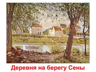 Документ посвящен творчеству художника Альфреда Сислея, представителя импрессионизма. Описываются его картины, изображающие различные пейзажи, включая деревни и мосты на берегу Сены, а также сезонные изменения природы. Основное внимание уделяется образам весны и других времен года, фиксирующим красоту окружающего мира.
