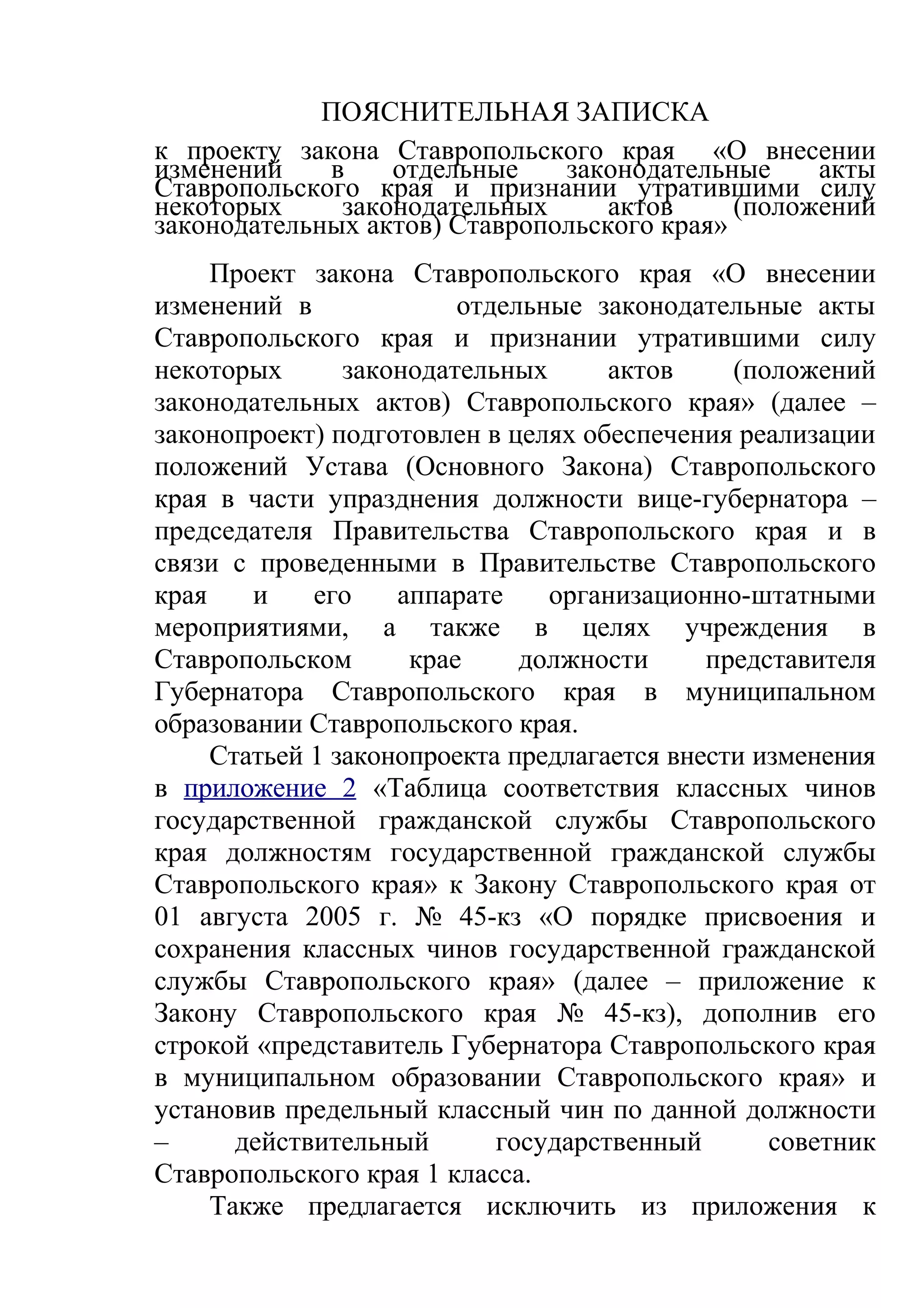 Документ представляет пояснительную записку к законопроекту Ставропольского края о внесении изменений в законодательные акты, касающиеся упразднения должности вице-губернатора и учреждении позиции представителя губернатора в муниципальном образовании. Законопроект предлагает изменения в несколько существующих законов Ставропольского края, включая корректировки в системах классных чинов и окладах для новых и упраздненных должностей. Кроме того, на реализацию изменений потребуется дополнительное бюджетное финансирование в размере 1,465 млн рублей в год.
