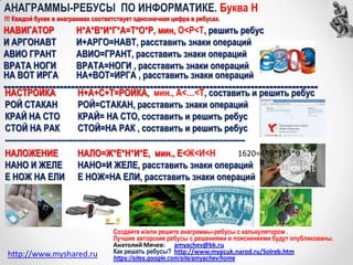 Документ описывает процесс создания и решения анаграмм-ребусов в информатике, где каждой букве соответствует цифра. В нём представлены примеры, правила и ссылки на калькуляторы для работы с ребусами. Также указаны ограничения на математические функции и формат записи для корректного решения задач.