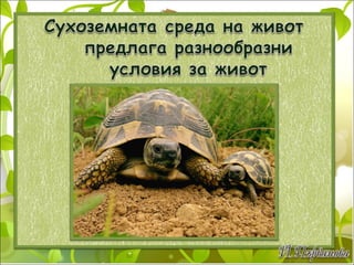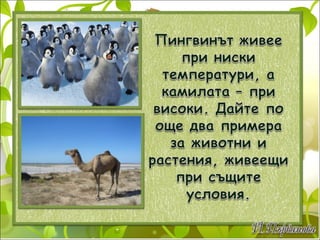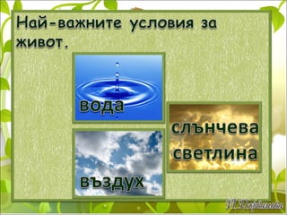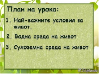 среда на живот 1. 2. 3. 4. 5. за растенията за животните вода въглероден диоксид слънчева светлина вода храна кислород убежище Най-благоприятна температура – от 20º до 25º 6. 7. 8. Чистата вода е прозрачна течност и слънчевата светлина прониква на голяма дълбочина във водните басейни. Водораслите я използват за произвеждане на хранителни вещества. Когато водата е замърсена, прозрачността й намалява. 2. Водата е добър разтворител. Растенията приемат от водата разтворените минерални соли и въглероден диоксид и отделят кислород. Така те обогатяват водата с кислород, който се използва от водните организми за дишане. От водата водните организми набавят и своята храна – растения и други по-малки животни. 3. Водата се нагрява и охлажда по-бързо от сушата. През деня тя поглъща слънчева енергия и се нагрява, а през нощта бавно се охлажда. Така се поддържа подходяща за водните обитатели температура. 9. 10. На места, където падат много валежи, почвата е влажна и растителността е богата. Има храна и за животните. 11. Там където падат малко валежи, почвите са сухи, а растителността бедна. Растенията си изработват приспособления за оцеляване в този климат. 12. 13. 14. 15. 16. 17.