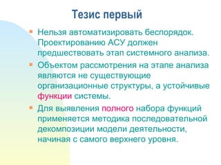 Документ описывает автоматизированную систему управления факультетом и её принципы построения, включая анализ, проектирование и реализацию подсистем, таких как 'студент', 'учебный процесс' и 'электронная библиотека'. Рассматриваются этапы системного анализа, отбор автоматизируемых функций и организационные проблемы внедрения системы. Заключение подчеркивает индивидуальность каждой системы и трудности, связанные с её реализацией.