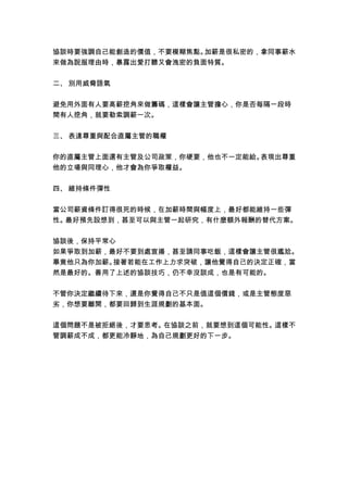 維持條件彈性 當公司薪資條件訂得很死的時候,在加薪時間與幅度上,最好都能維持一些彈 性。最好預先設想到,甚至可以與主管一起研究,有什麼額外報酬的替代方案。 協談後,保持平常心 如果爭取到加薪,最好不要到處宣揚,甚至請同事吃飯,這樣會讓主管很尷尬。 畢竟他只為你加薪。 接著若能在工作上力求突破,讓他覺得自己的決定正確,當 然是最好的。善用了上述的協談技巧,仍不幸沒談成,也是有可能的。 不管你決定繼續待下來,還是你覺得自己不只是值這個價錢,或是主管態度惡 劣,你想要離開,都要回歸到生涯規劃的基本面。 這個問題不是被拒絕後,才要思考。在協談之前,就要想到這個可能性。這樣不 管調薪成不成,都更能冷靜地,為自己規劃更好的下一步。