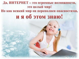 Документ поднимает вопросы безопасности детей в интернете, указывая на риски, связанные с доступом к опасному контенту и возможностью взаимодействия с преступниками. Он акцентирует внимание на важности защиты личной информации и безопасности в сети, предлагая практические советы по обеспечению такой безопасности. Также упоминаются ресурсы для обучения и развития детей в интернете, подчеркивая необходимость баланса между пользой и рисками виртуального мира.